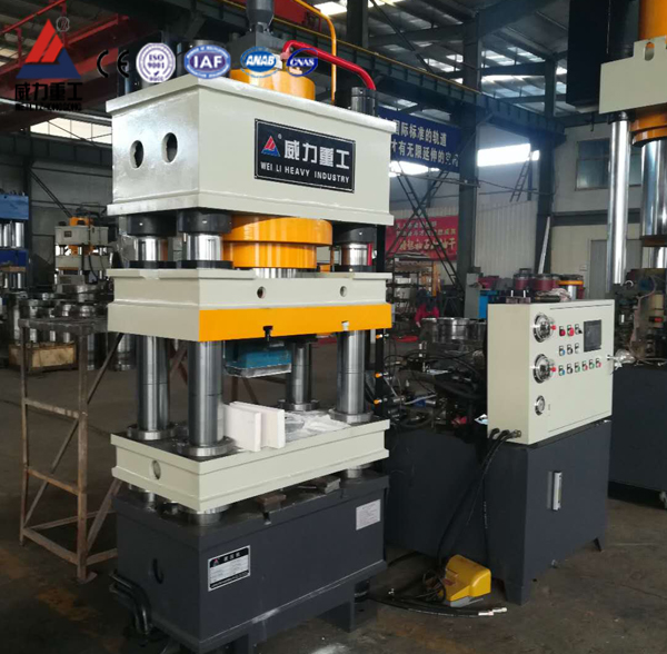 山東威力重工生產(chǎn)的250噸四梁四柱液壓機|粉末壓制成型機主要是模壓成形是將松散的粉末裝入模具內(nèi)受壓成形。模壓成形一般在普通的機械壓力機或液壓機上進行,常用壓力機的噸位為500~5000 kN。實際生產(chǎn)中可通過提高模具內(nèi)壁光潔度來降低模具高徑比,采用雙向壓制等方法來改善壓坯密度不均勻。